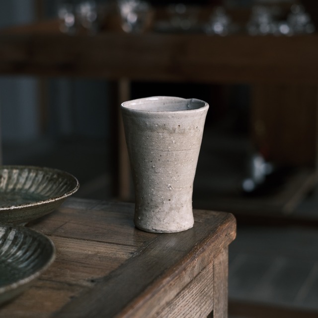 【備考欄へメッセージをご記入ください】 無言でのお買い物はお断りしています。 作り手・伝え手・使い手の間にいつも良い循環が生まれることを願い、ONLINEの場を設けています。ご賛同くださる方のみお買い物ください。初めてご利用の方はInstagramの固定投稿もご一読ください。 ■今回のトークテーマは「冬の楽しみ」です■ 購入画面の備考欄に、ぜひエピソードを書き綴ってください。色んなお話ができるのを楽しみにしています。勿論、テーマ以外にお話したいことがあれば自由に書いてもらってOKです(店主土屋)。 ---------------------------------------- 細身で背の高いフリーカップ。このスラリとした形が無性に心を掴みます。 雑味のある白色はどこか古物にも似ていて、使い慣れる頃にはさらに味わい深く心に訴えかけてくるんじゃないかなと想像します。土の粒感もありますが、ツルッとした質感です。 分かりやすい色やデザインもいいけれど、こういう質素で簡素なものの中にある美が好きです。 ビールを飲んでもいいし、美味しい果実酒なんかをちびちびやるのもいいですね。 ---------------------------------------- 直径:8cm 高さ:11.5cm 容量:250ml ※個体差を承知の上、ご購入ください。