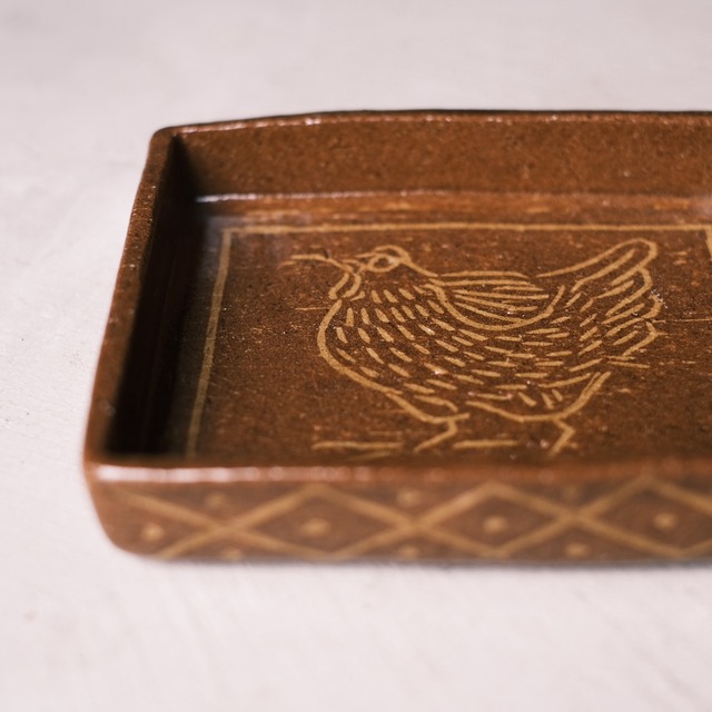 【備考欄へメッセージをご記入ください】 無言でのお買い物はお断りしています。 作り手・伝え手・使い手の間にいつも良い循環が生まれることを願い、ONLINEの場を設けています。ご賛同くださる方のみお買い物ください。初めてご利用の方はInstagramの固定投稿もご一読ください。 ■今回のトークテーマは「最近行って良かった場所」です■ 購入画面の備考欄に、ぜひエピソードを書き綴ってください。色んなお話ができるのを楽しみにしています。勿論、テーマ以外にお話したいことがあれば自由に書いてもらってOKです(店主土屋)。 ---------------------------------------- まるまる太った鶏が愛嬌たっぷり。側面にも柄があります。 象嵌(ぞうがん)といって、土を彫ったところに別の土を埋め込み絵柄を際立たせる技法です。 「丸いお皿ばかり」というお家にも是非アクセントとしておすすめ。 ---------------------------------------- 直径:14×14.5cm 高さ:2.5cm(高台なし) ※個体差を承知の上、ご購入ください。