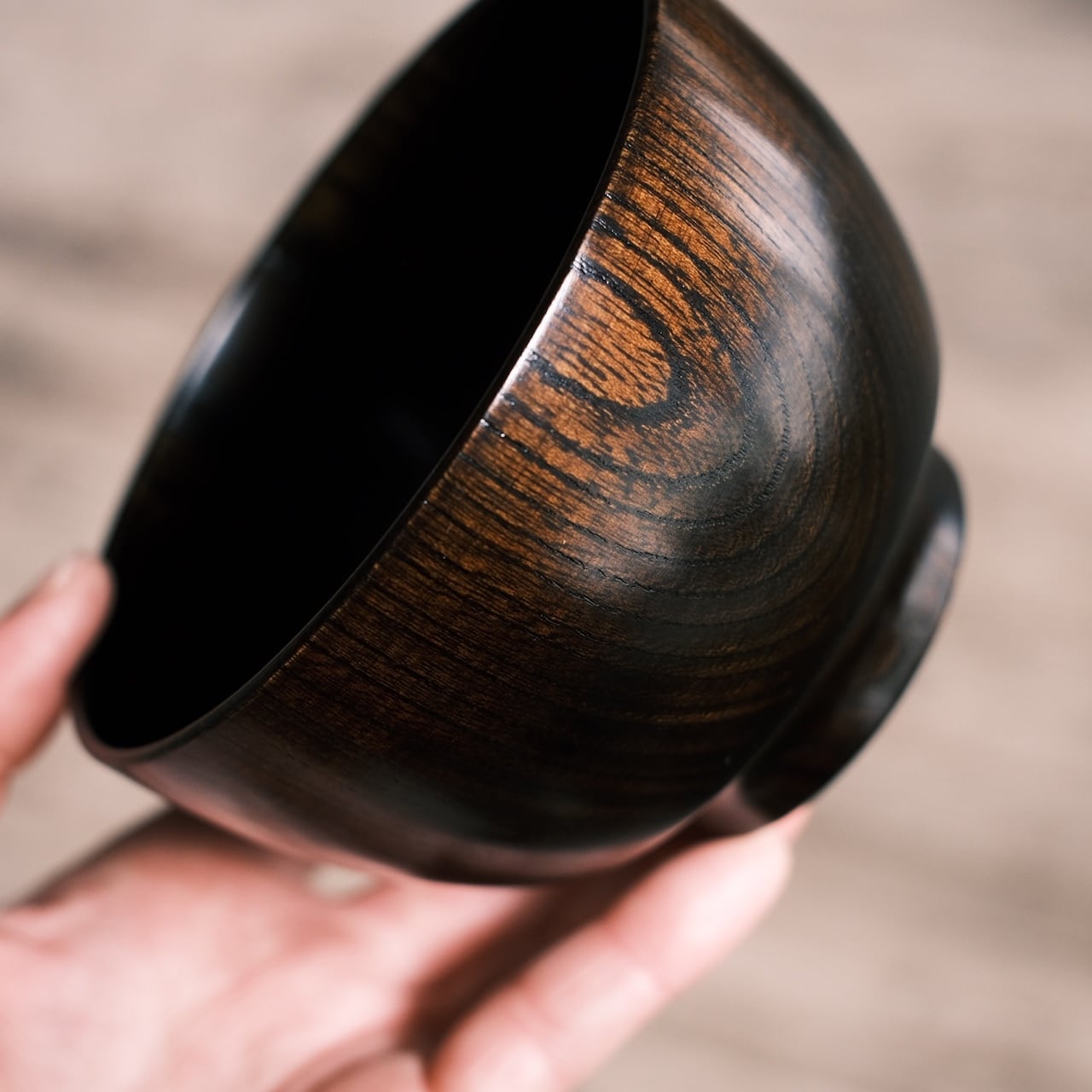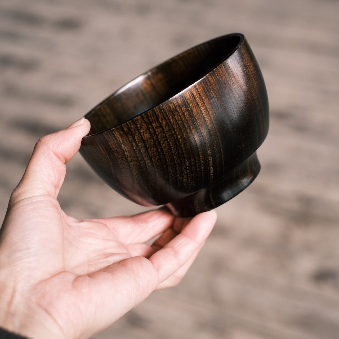 鉄で染めたケヤキは、木目が程よく馴染んでとてもカッコいいです。食卓で変に浮いてしまうこともなく、また総漆のお椀ほど和に偏りすぎることもありません。気軽だけれどしっかり使える、長く相棒でいてくれる逸品です。