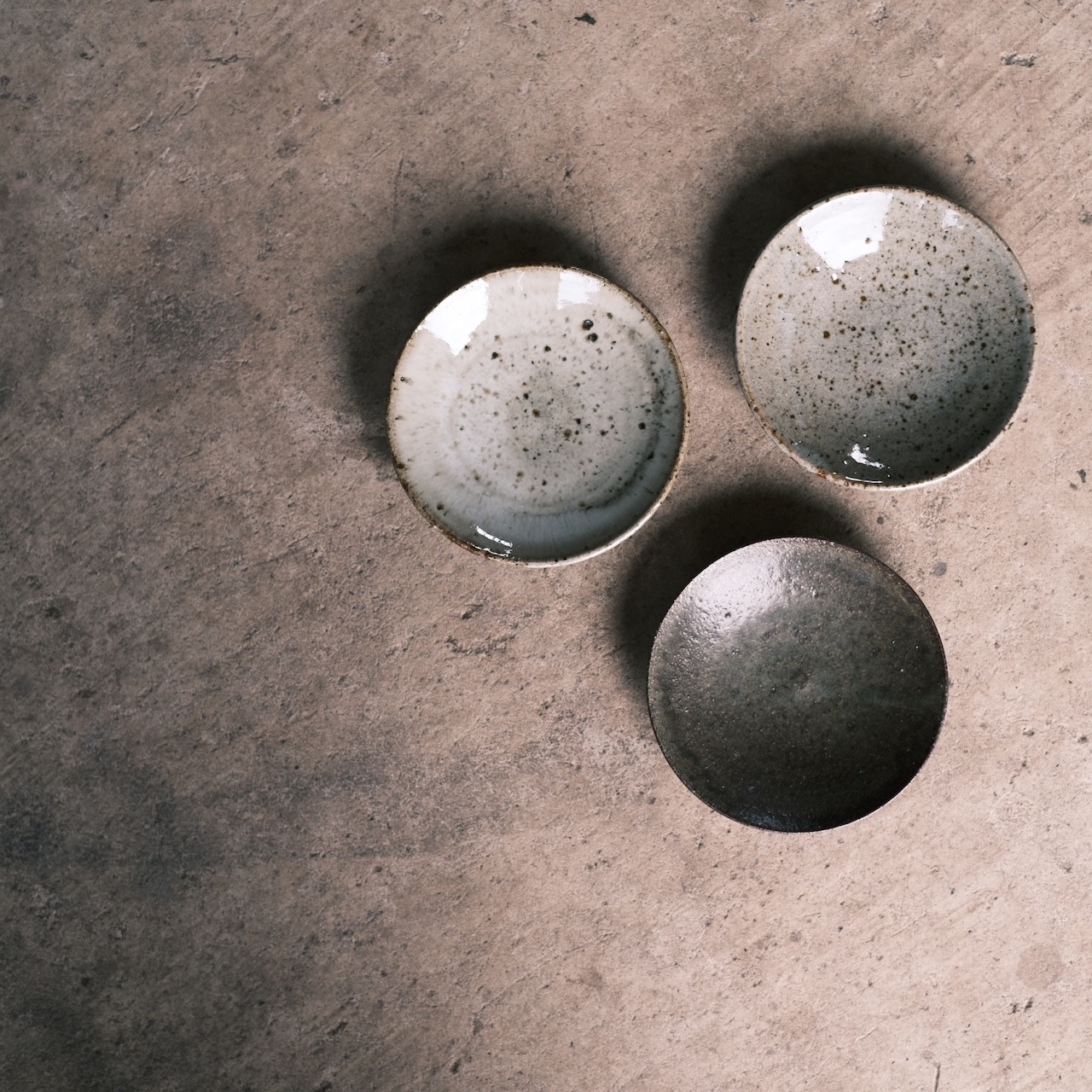 藁灰釉:黄色みのある生成色で、作為的ではない濃淡の美しさが醍醐味。個体差は大きいですが、同じものが二つとないところが面白いです。温かみは群を抜きます。