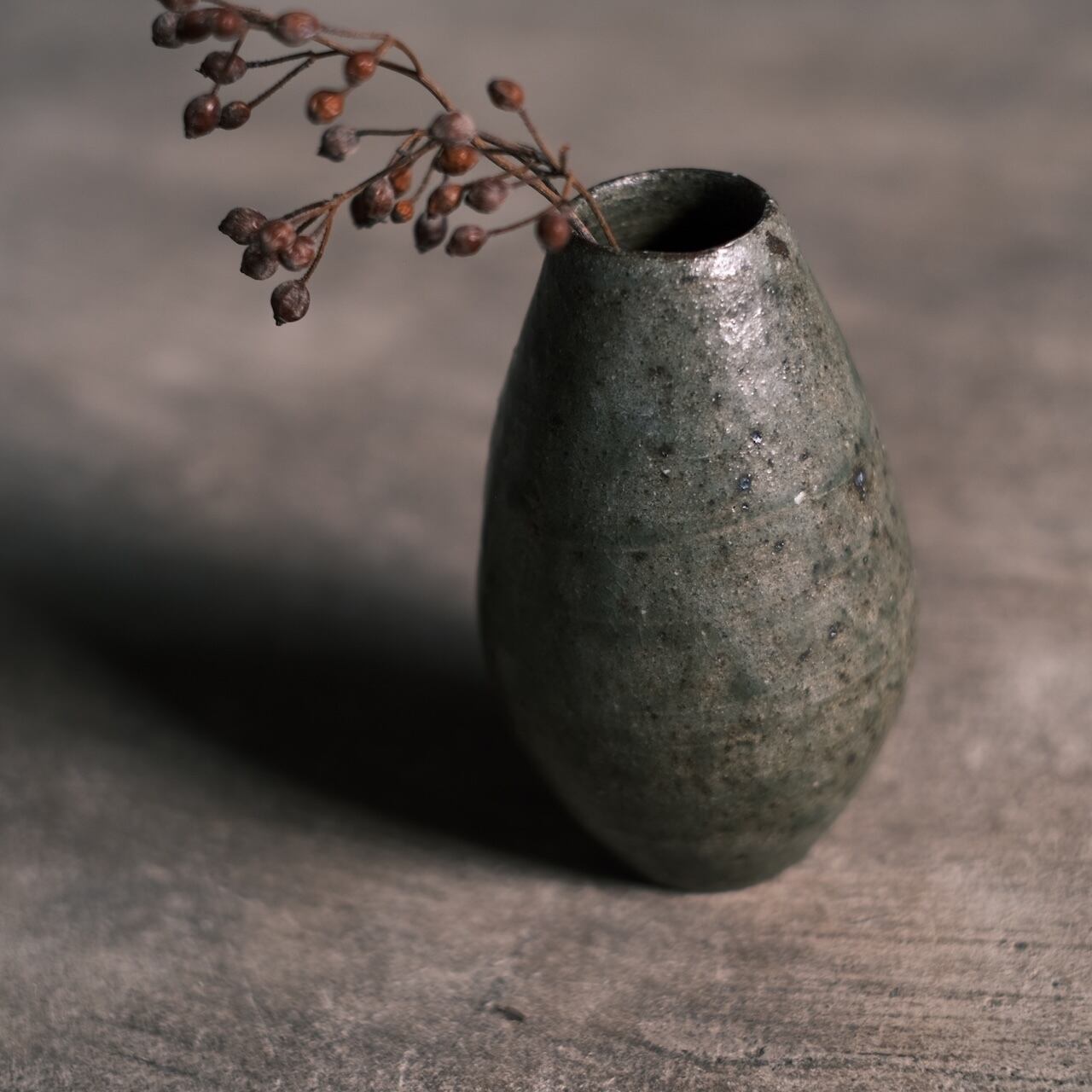 シンプルですが緩やかな曲線が美しく、物静かな雰囲気が魅力です。Bよりも一回り小さいので生けられる植物も限られますが、小さな空間にポンと置くには丁度良い。間近で見ると釉薬の流れが素朴で美しいです。