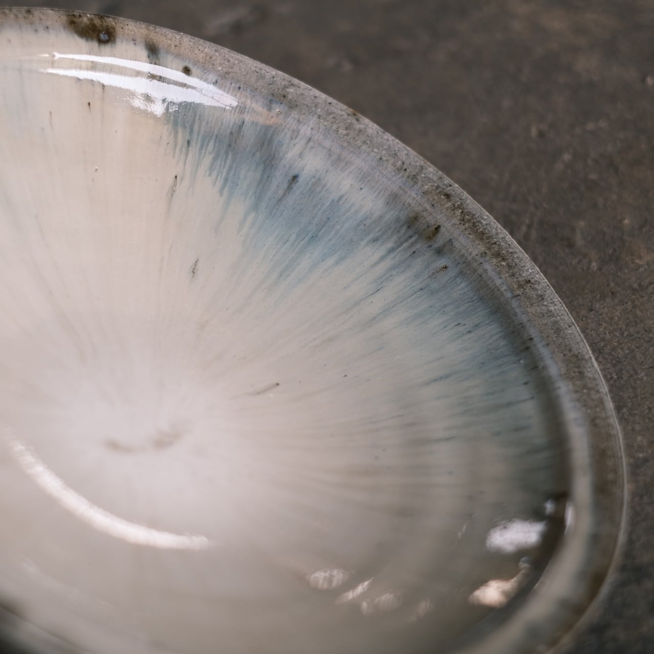 いつものガス窯での藁灰釉は黄色がかった暖色が特徴ですが、薪窯での藁灰釉は全く雰囲気が異なります。透き通るような青み、釉薬の無作為な流れがとても魅力的。渋いことは渋いのですが、柏井さんの上品な形づくりが合わさって、どこか穏やかさも感じる美しさです。