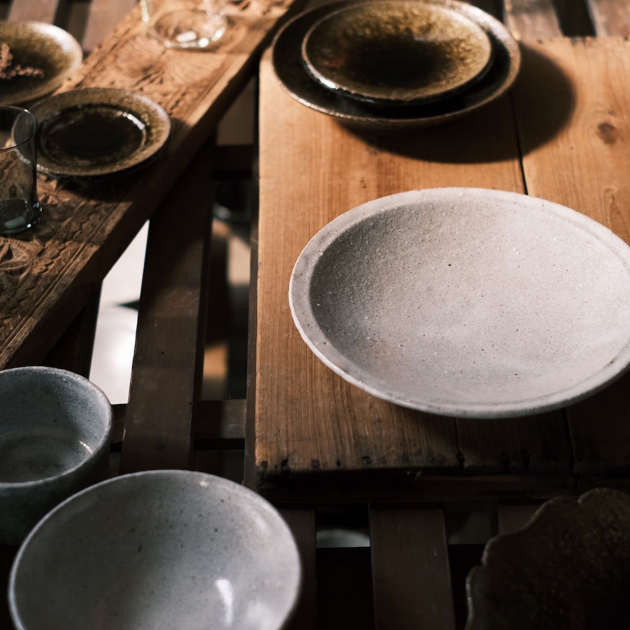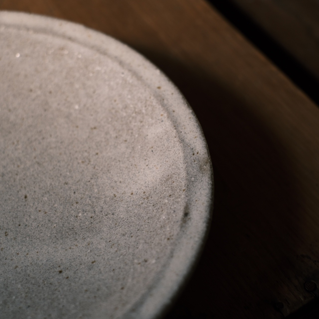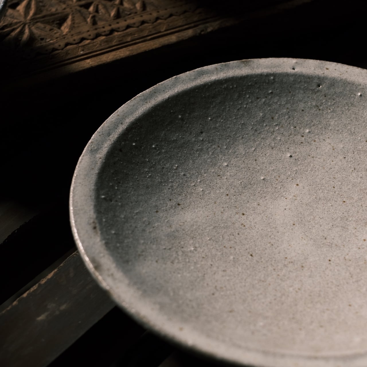 白釉は名前の通り白色なのですが、鉄分の橙色の点々がところどころにあり、それが全体の景色になっていて良い味を出しています。ざらっとした質感。まさに主役な一皿です。