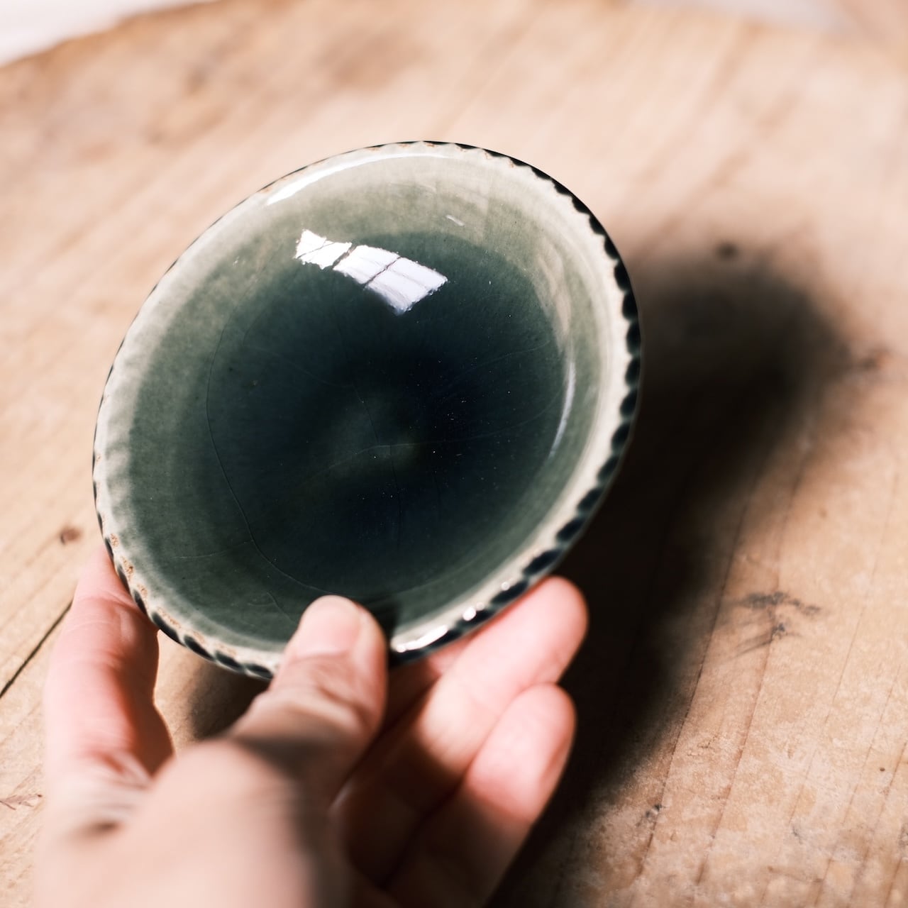 呉須色は、暗いところだと深い群青色に、明るいところだと緑の要素も見えます。