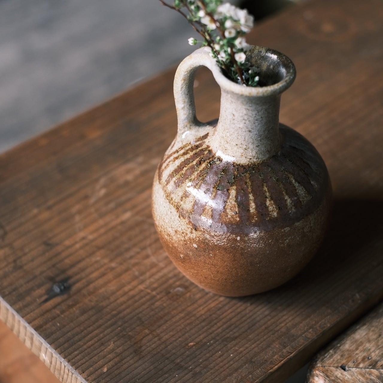 野の花など素朴な植物を一本生けてあげるだけで良いと思います。古い布を敷いても相性が良さそう。