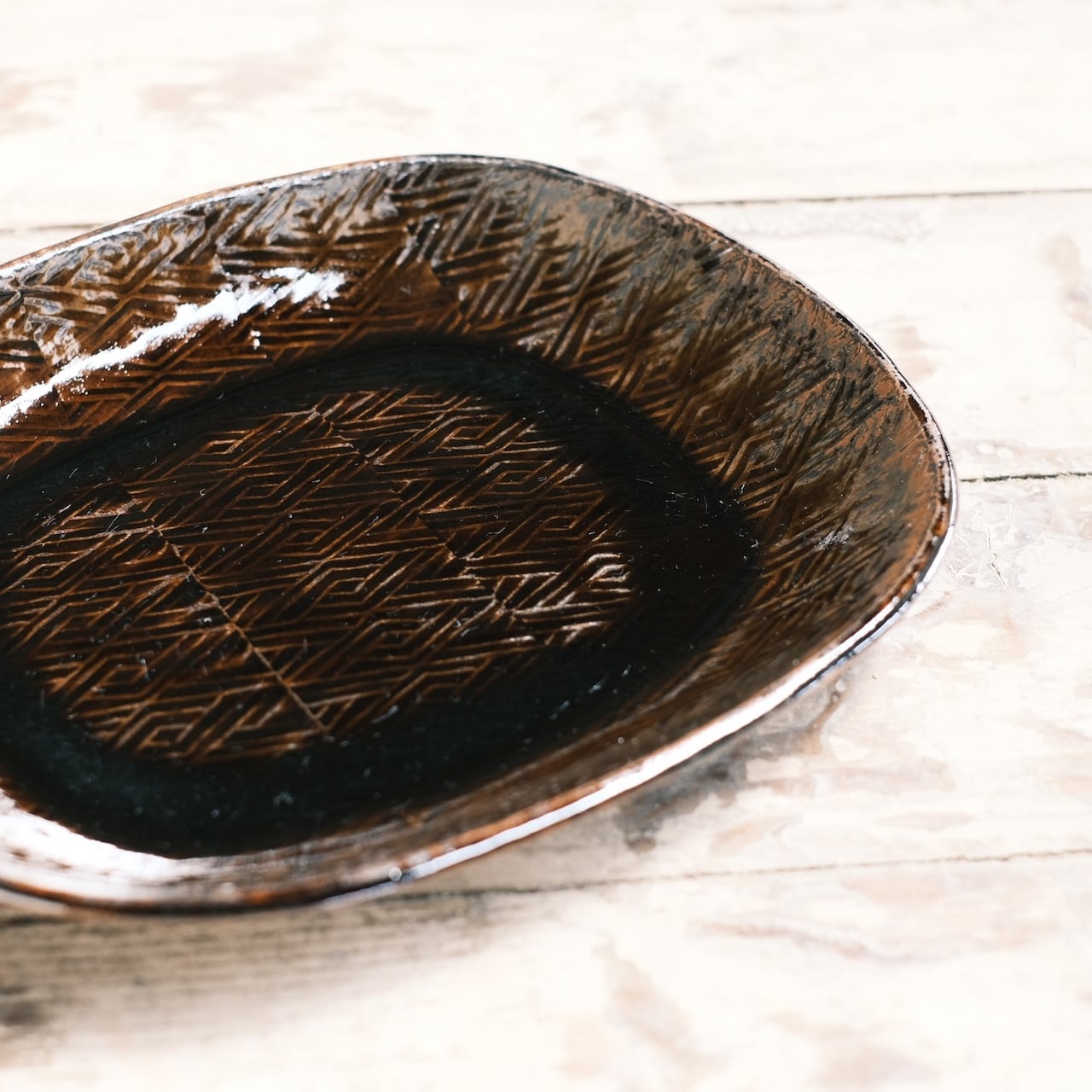 Bは飴色の押紋。小サイズより深みのある渋い焦茶色です。明るい色の食材を引き立てます。