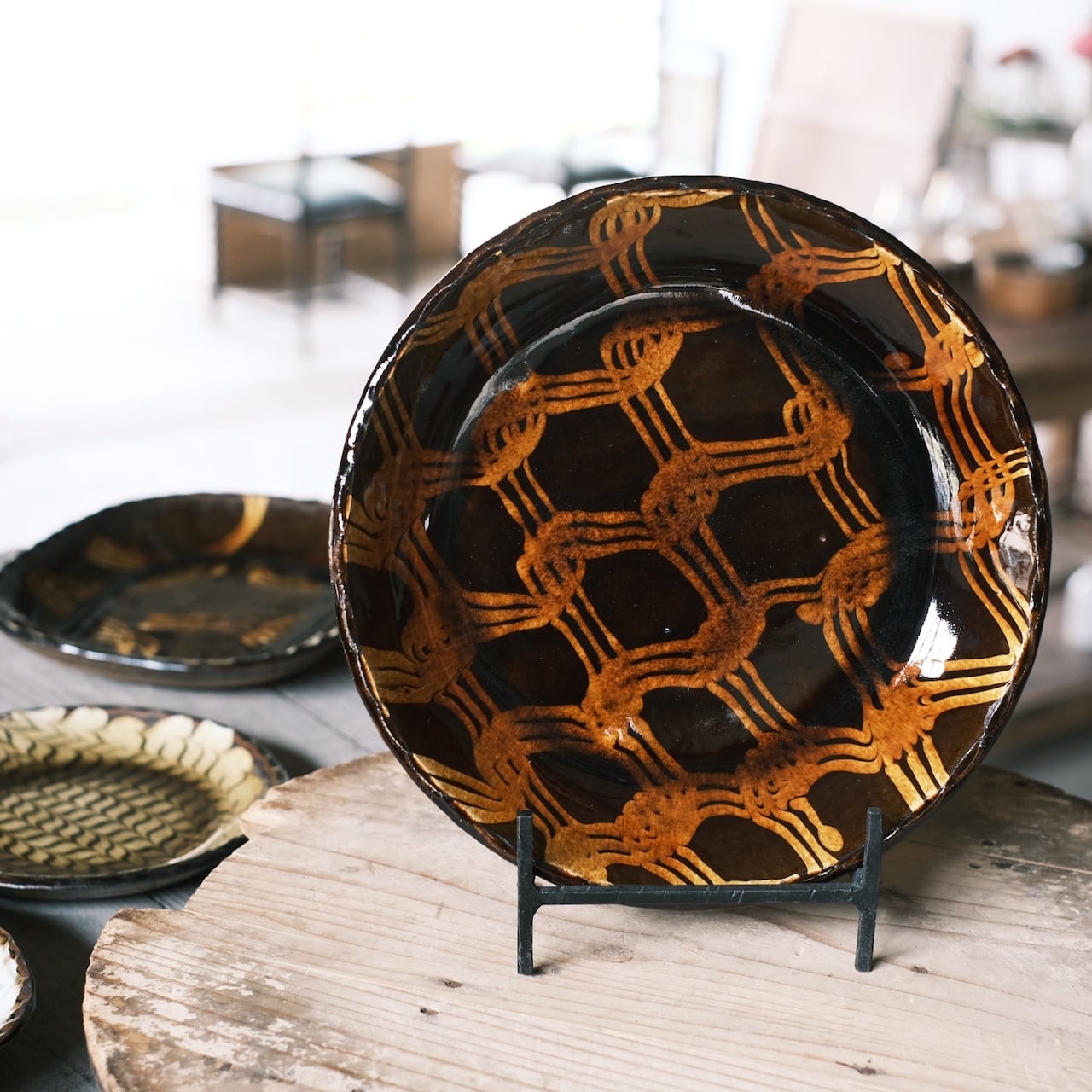 同じ飴色のスリップウェアでも、丸皿と角皿では印象が全く変わりませんか?面白いなぁと思います。