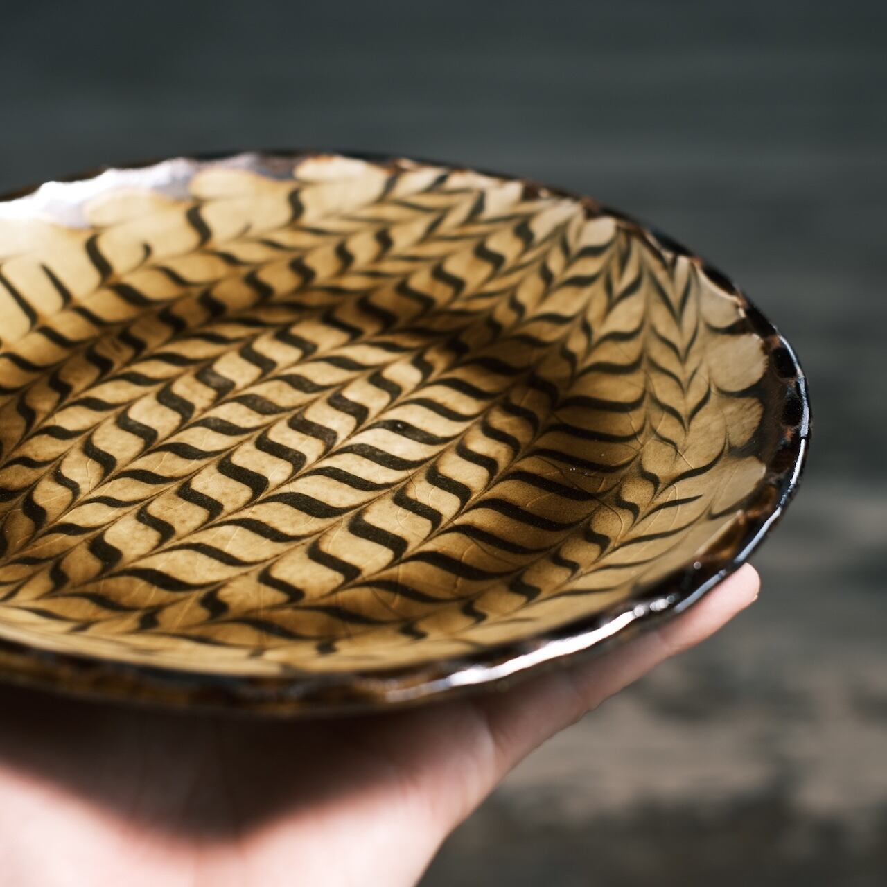 とても印象的な矢羽根模様のスリップウェア。