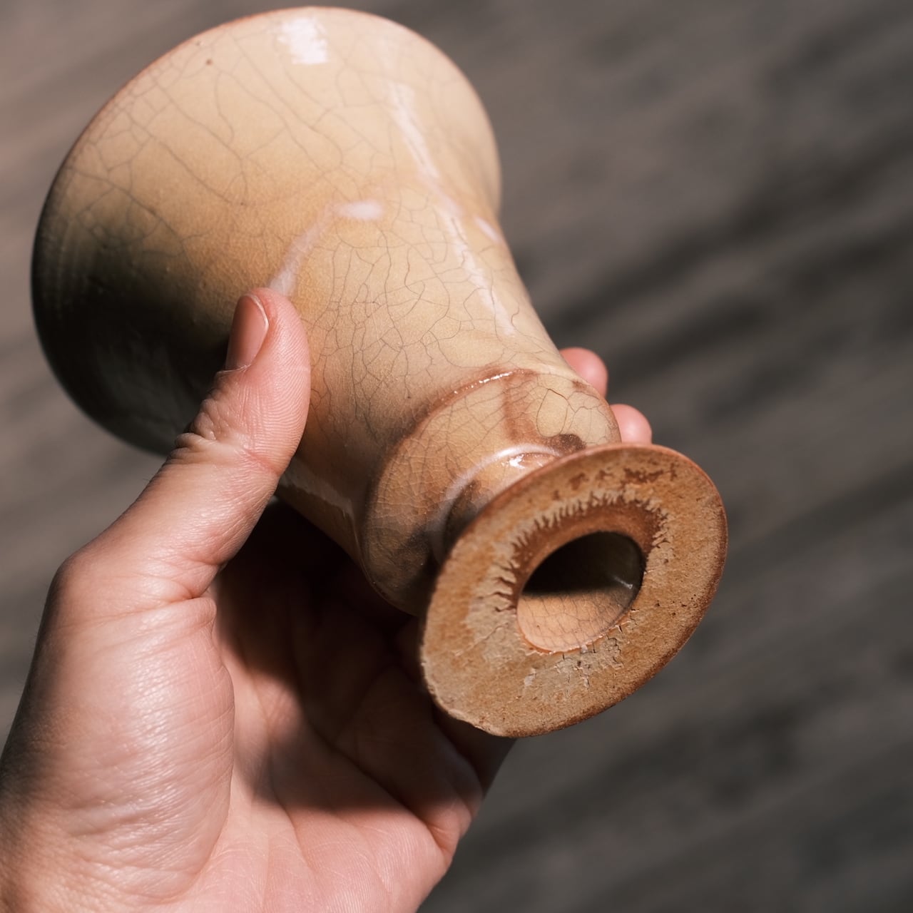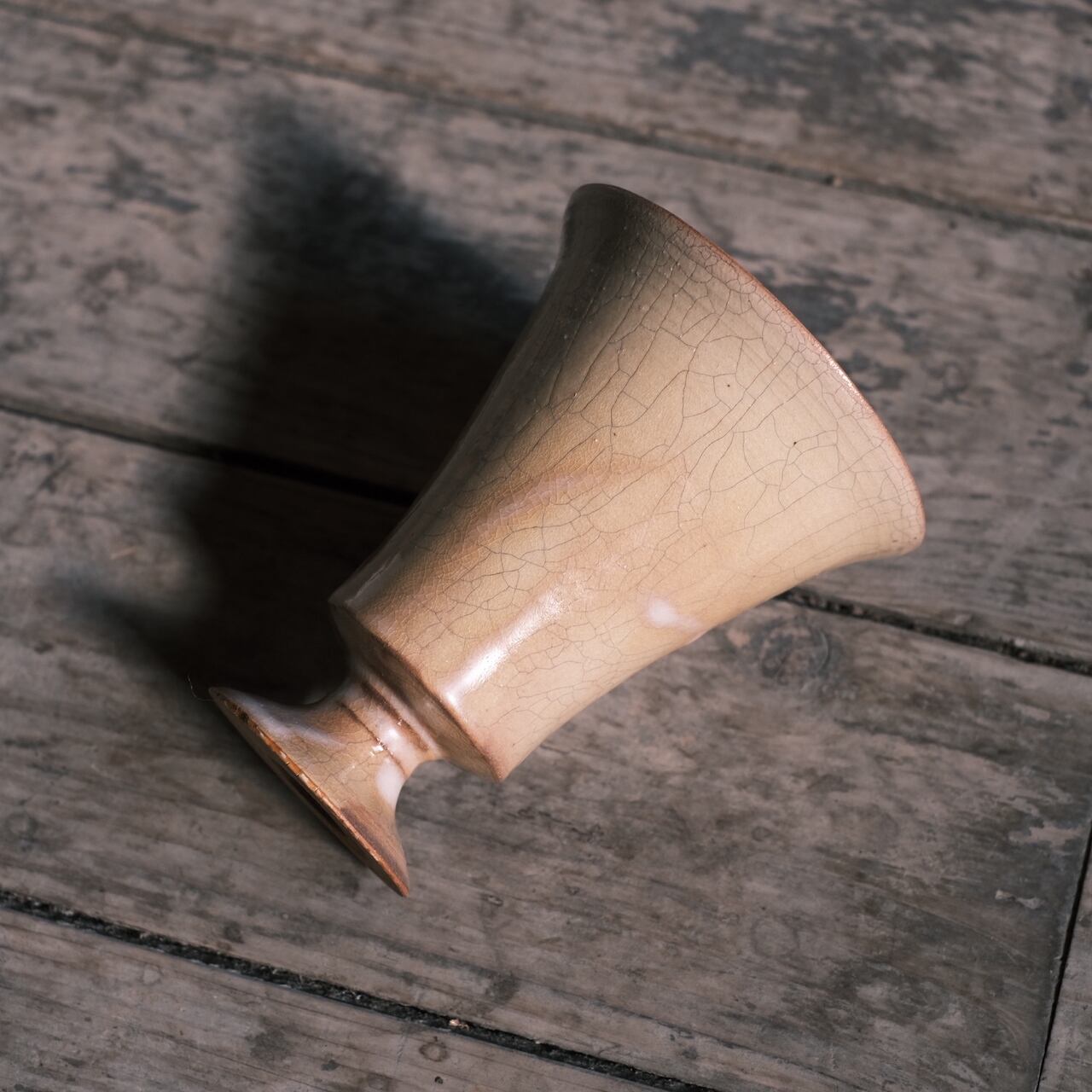 今回いただいてきた中で、唯一の藁ヒビ粉引であるこちら。土と釉薬の伸縮を利用して、ヒビが入ったような表情を作っています。橙色とも黄土色とも言える、独特な温かみの色。