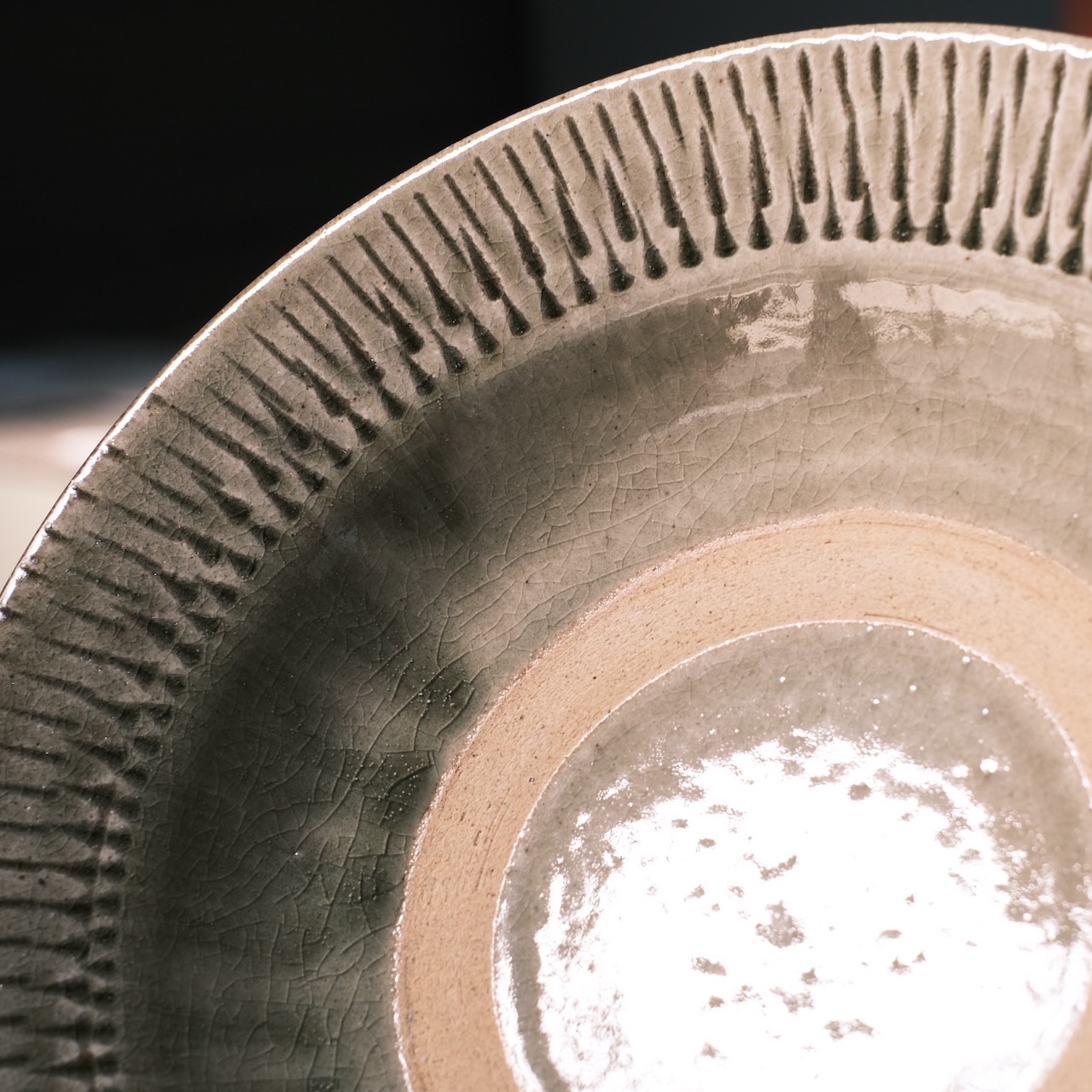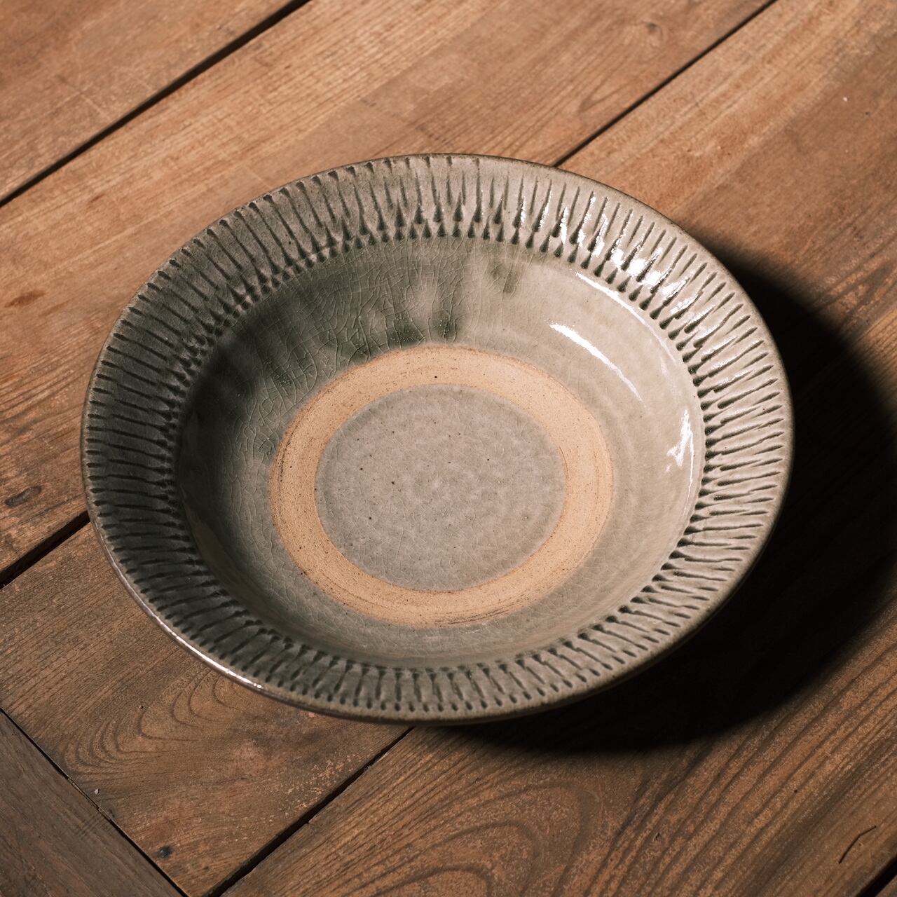 うっすら緑がかった灰釉は食べ物との相性も抜群。ぜひフチの余白を残してお料理を盛ってください。一人用ならパスタや大盛りカレー、大皿としてなら揚げ物や煮物やサラダに。