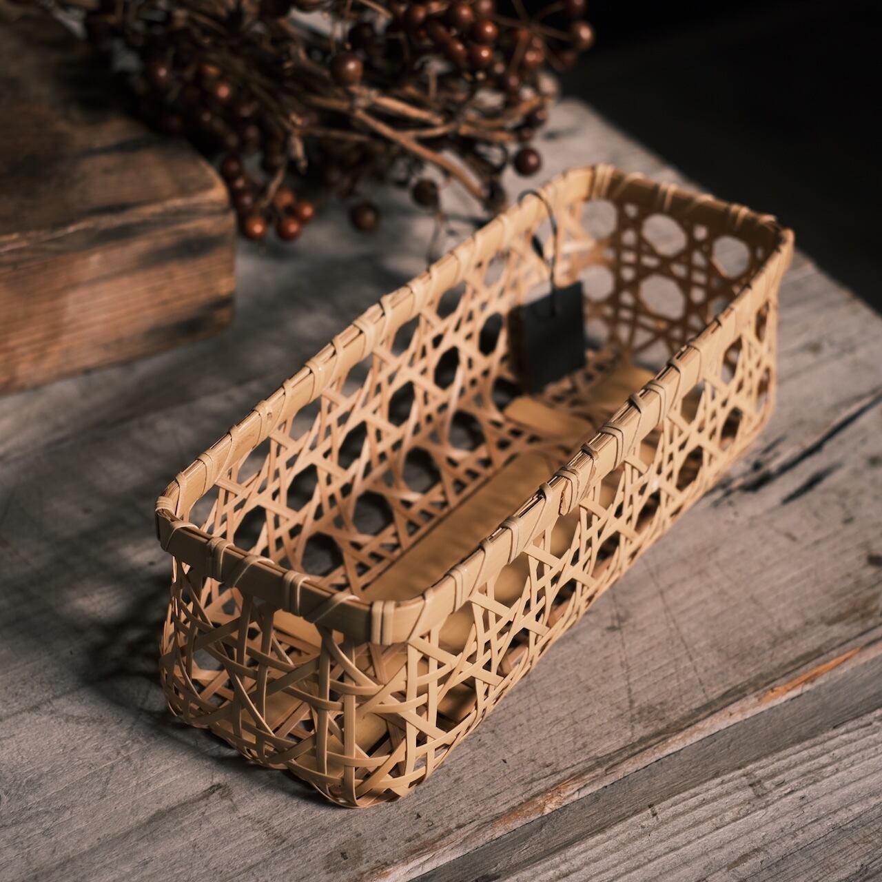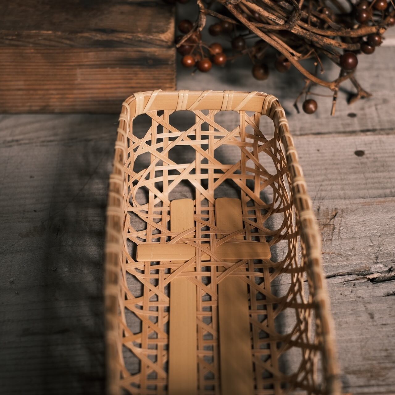 竹ひごの本数が多く、パッと華やかな空気を纏っています。これぞ竹かご編み!