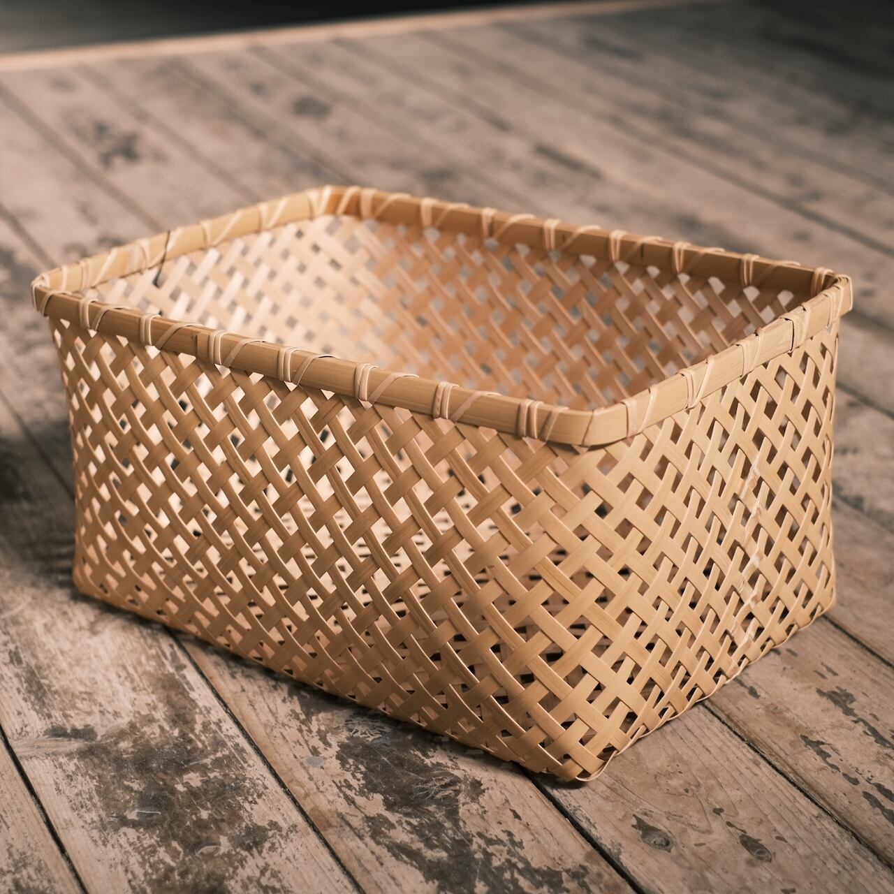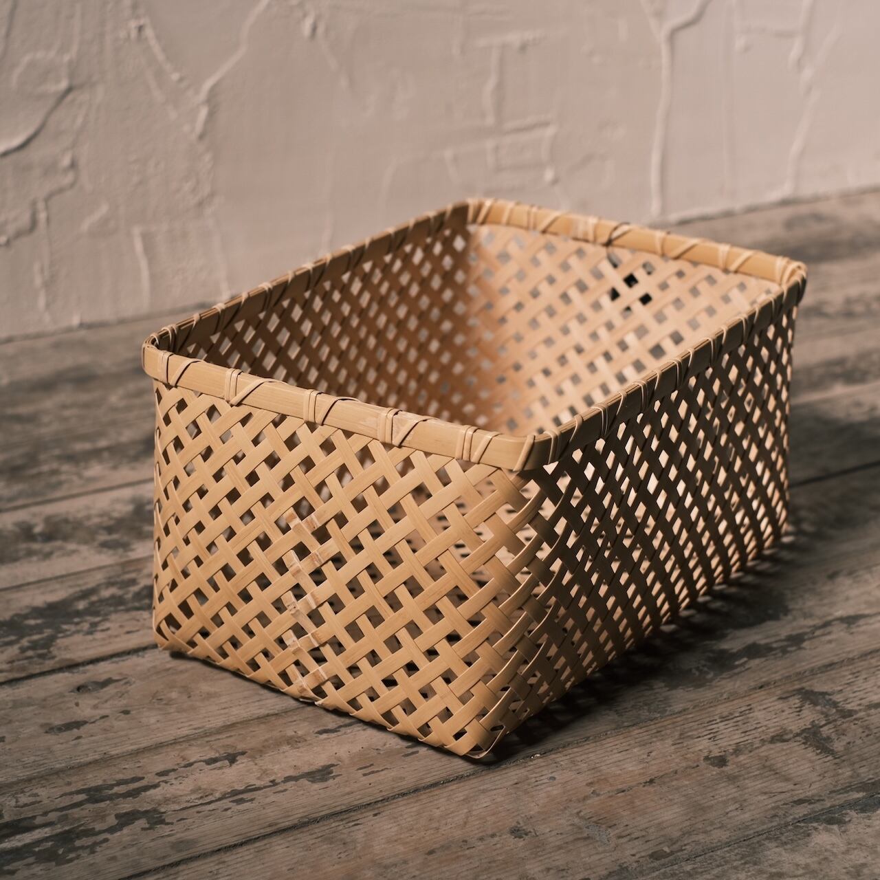 「八つ目収納かご」が繊細で華やかなのに対して、こちらはもっとサッパリしています。どんな棚やインテリアとも合わせやすく、北欧系の家具なんかにも意外と馴染みます。